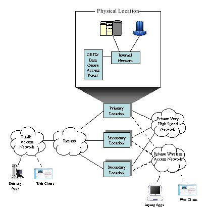 The virtual HPDC consists of three core physical sites, one primary and two secondary. These three sites are linked using a very high-speed network (1-10Gbps). Each site has a full service capability and has data storage replication of the other sites. The difference between the primary and secondary sites is in the available Grid processing power and that only the primary site has resident support staff. Access to the service is supported through an Internet portal linked to a broad range of telecommunications suppliers and a mix of private wire/wireless access networks. The wireless access network should be made available throughout South Yorkshire to provide anywhere, anytime access to the HPDC virtual service.